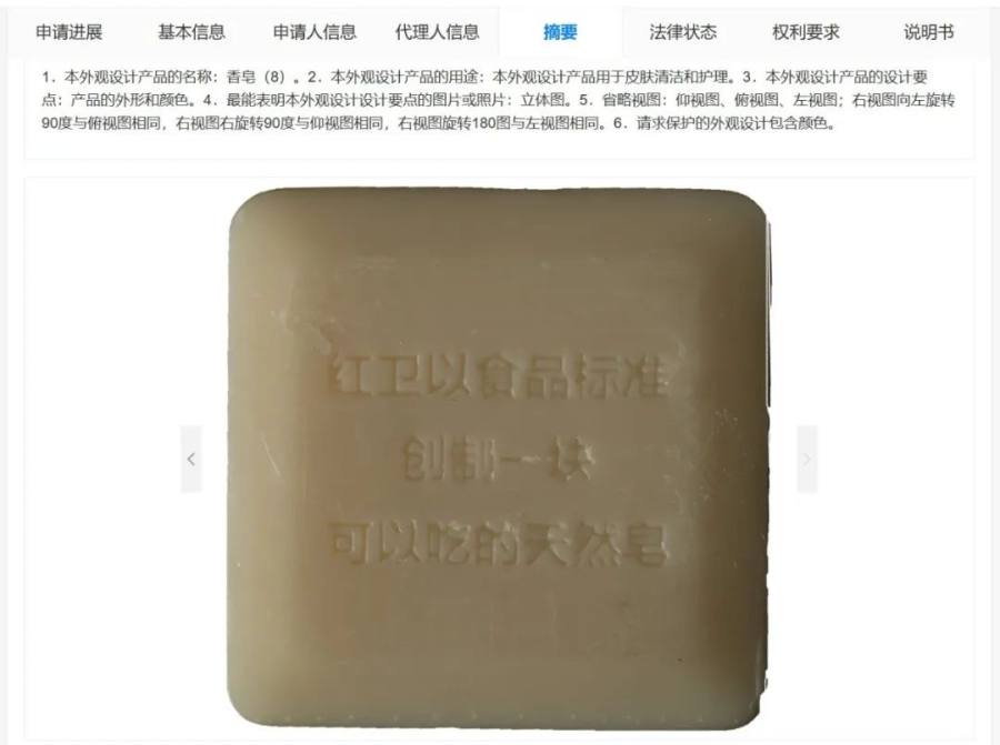 此外,该公司已获得多项产品专利授权,其中多项“香皂”外观专利附图显示,其产品印有“红卫以食品标准创制一块可以吃的天然皂”字样。