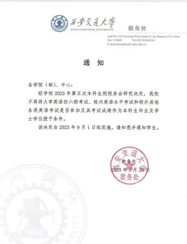 近日,网传西安交通大学不再将大学英语四六级考试成绩作为学位授予条件。上述消息冲上热搜,引发网友热议。随后,西安交通大学教务处工作人员表示,消息属实,这是通过商议决定的,其他学校也有,并不是一个奇怪的决定。(9月21日央视网)
