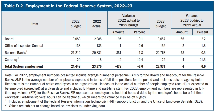 美联储在去年年报中曾披露,到2022财年末实际雇佣人数为23970人,而2023年的预算编制为23974人。值得一提的是,在2022财年美联储大概有500个预算内岗位处于空缺的状态,所以在预算层面上其实已经“预告”过裁员的情况了,而且实际减员的人数还要略低于预期削减的状况。