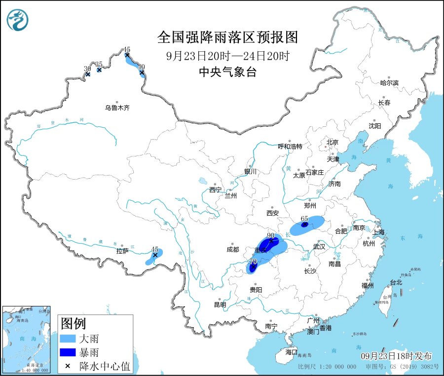 中央气象台9月23日18时继续发布暴雨蓝色预警:预计,9月23日20时至24日20时,贵州东北部、重庆、湖北西部、河南南部及北疆北部、西藏东南部等地部分地区有大雨,其中,贵州东北部、重庆中北部、湖北西南部、河南南部等地局地有暴雨(50~90毫米)。上述部分地区伴有短时强降水(最大小时降雨量20~40毫米,局地可超过50毫米),局地有雷暴大风等强对流天气。