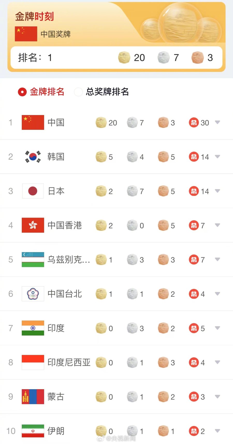9月24日,亚运开幕后首个比赛日,中国队斩获20金7银3铜,共计30枚奖牌,位列奖牌榜第一名。
