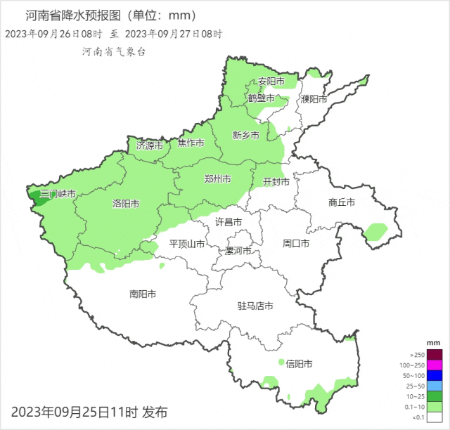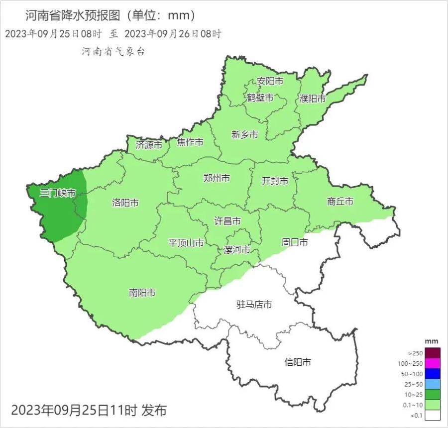 25日下午,全省阴天,淮河以北大部有小雨或零星小雨,其中洛阳、平顶山、商丘部分县市有中雨。