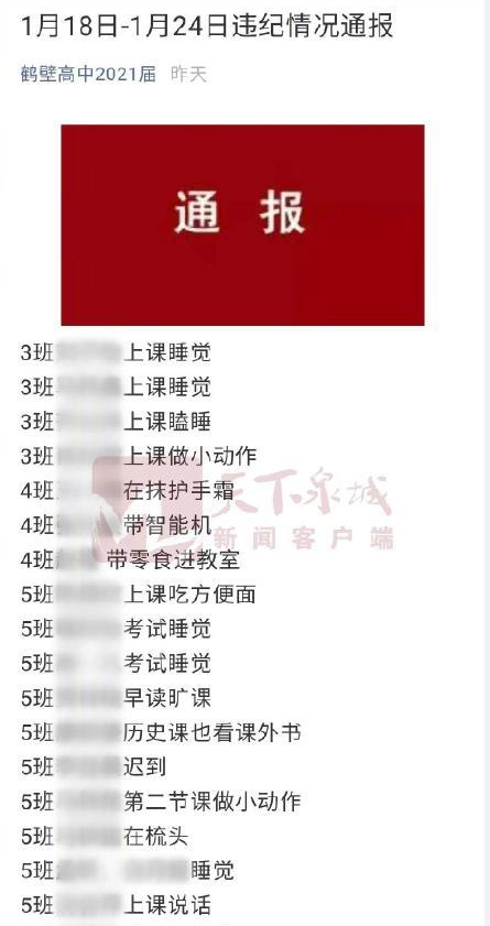 谁能想到,一条普普通通的学校违纪情况通报突然在这个下午刷屏了。今天,鹤壁高中用公众号推送的《1月18日-1月24日违纪情况通报》,阅读量短时间内暴增,在朋友圈里结结实实地刷了屏。