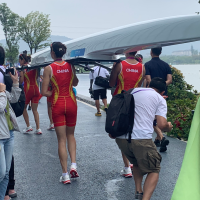 在水面上劈波斩浪之余,扛着艇出库、下水,再扛着上岸、入库,是每个赛艇运动员的“陆上必修课”,不能,也不得由别人代劳。不同型号的赛艇,重量不同。吕扬她们的这条四人艇重52公斤,分摊在每人身上的重量为13公斤,对于身材高大的运动员来说,这活儿不难,但也不算轻松。