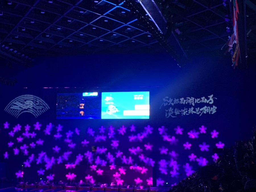 这场比赛临近开始,场内突然变暗,灯光秀开始上演,五彩灯光让室内美轮美奂,屏幕上打出来的诗句也是恰到好处:欲把西湖比西子,淡妆浓抹总相宜。场内不时响起“千年等一回”的新白娘子传奇歌调,一下子让现场的人民唤起了多年前的回忆,赛前的这场灯光秀真是让在场的观众赏心悦目。