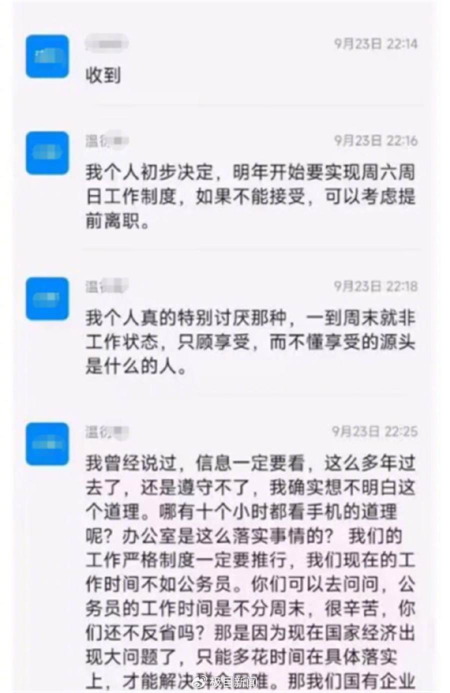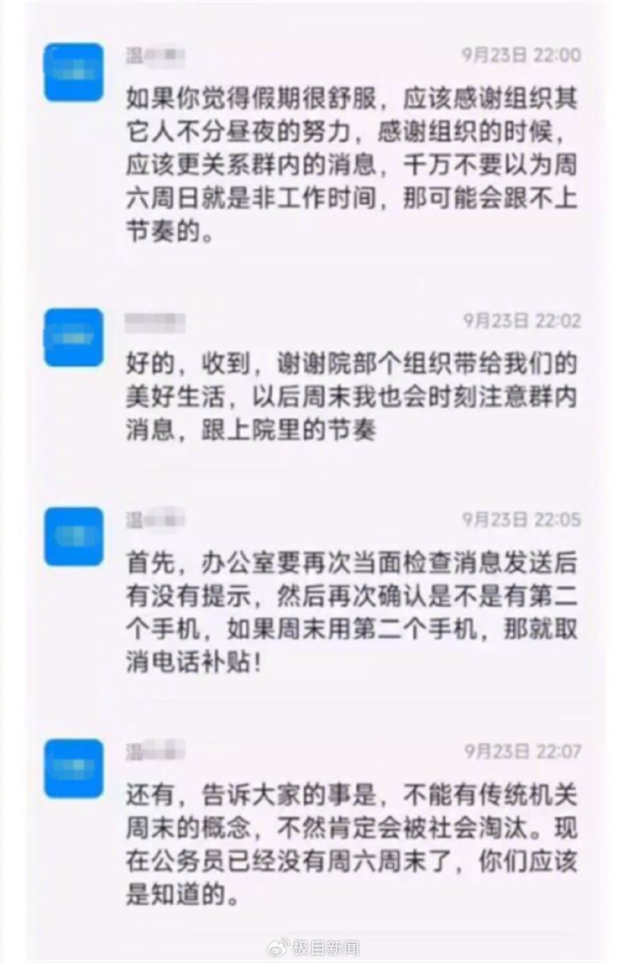 9月25日,一位网友发布的一段群聊聊天记录显示,由于林某等三人没有及时接收到江西某国企建筑设计院院长温某在群里的工作指示,温某在和林某等人沟通时称,“千万不要以为周六周日就是非工作时间,那可能会跟不上节奏的”。