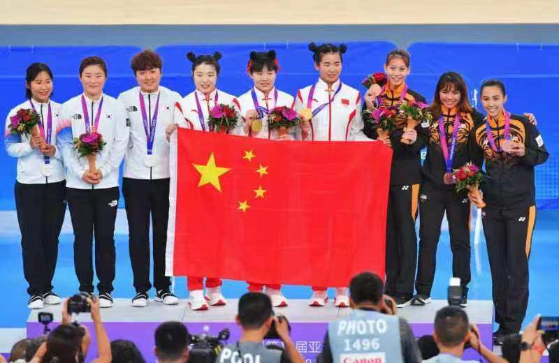 这届亚运会首次采用了最新规则,赛会记录也是全新的。从资格赛,到淘汰赛,再到决赛,中国队在一天之内三次出场,每次成绩都有所提高,而且三度刷新了亚运会纪录。在与韩国队的决赛中,鲍珊菊、郭裕芳、苑丽颖三人联袂跑出的46秒376的成绩,把8月份创造的亚洲纪录又缩短了0.07秒。