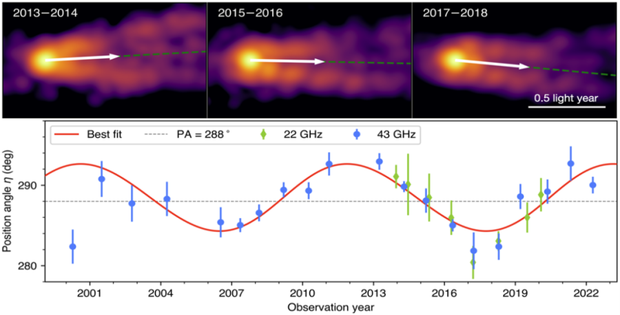 人类首次“看见”的那个黑洞,位于室女座一个巨椭圆星系M87的中心,距离地球5500万光年,质量约为太阳的65亿倍。2019年,科学家首次发布M87黑洞的图像,此后持续开展对M87黑洞的观测研究。这项最新研究成果的论文第一作者兼通讯作者、之江实验室博士后崔玉竹介绍,利用甚长基线干涉测量(VLBI)技术,科研人员在解析M87黑洞喷流结构过程中,惊奇地发现东亚VLBI网在2017年3月观测到的M87黑洞喷流指向,与以往有所不同。紧盯这一蛛丝马迹,通过深入分析近23年来全球多个VLBI网的观测数据,最终发现M87黑洞喷流呈现周期性摆动,摆动周期约为11年,振幅约为10度。这首次为黑洞自旋理论提供了最有力的观测证据。活动星系中心的超大质量黑洞,堪称宇宙中最具破坏性的神秘天体之一。它们引力巨大,通过吸积盘“吃进”大量物质,同时又将物质以接近光速的高速“吐出来”,力量之大可以“吐到”数千光年以外。宇宙中到底有什么力量可以改变黑洞喷流方向,使其产生周期性摆动呢?上图:2013年至2018年期间每两年合并后的M87喷流结构,观测频段为43 GHz。下图:基于2000年至2022年以一年为单位合并的图像得出的最佳拟合结果。科研人员制图