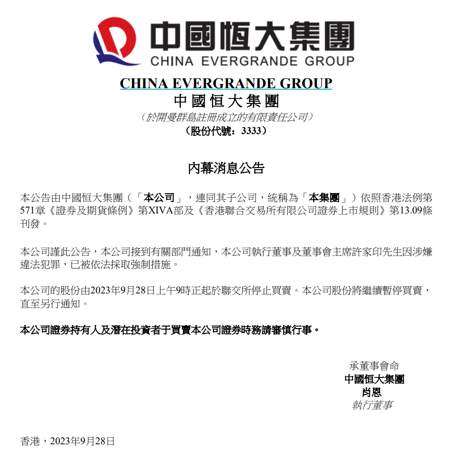 9月28日,中国恒大在港交所公告,本公司接到有关部门通知,本公司执行董事及董事会主席许家印先生因涉嫌违法犯罪,已被依法采取强制措施。本公司的股份由2023年9月28日上午9时正起于联交所停止买卖。本公司股份将继续暂停买卖,直至另行通知。