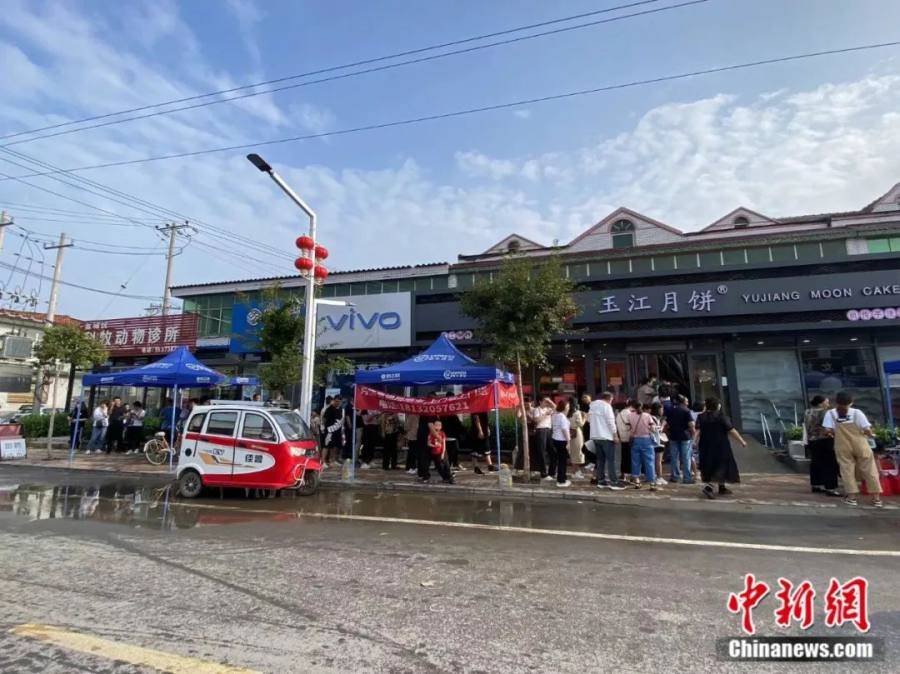 图为玉江月饼门前排起了长队。 中新网记者 李玉素 摄