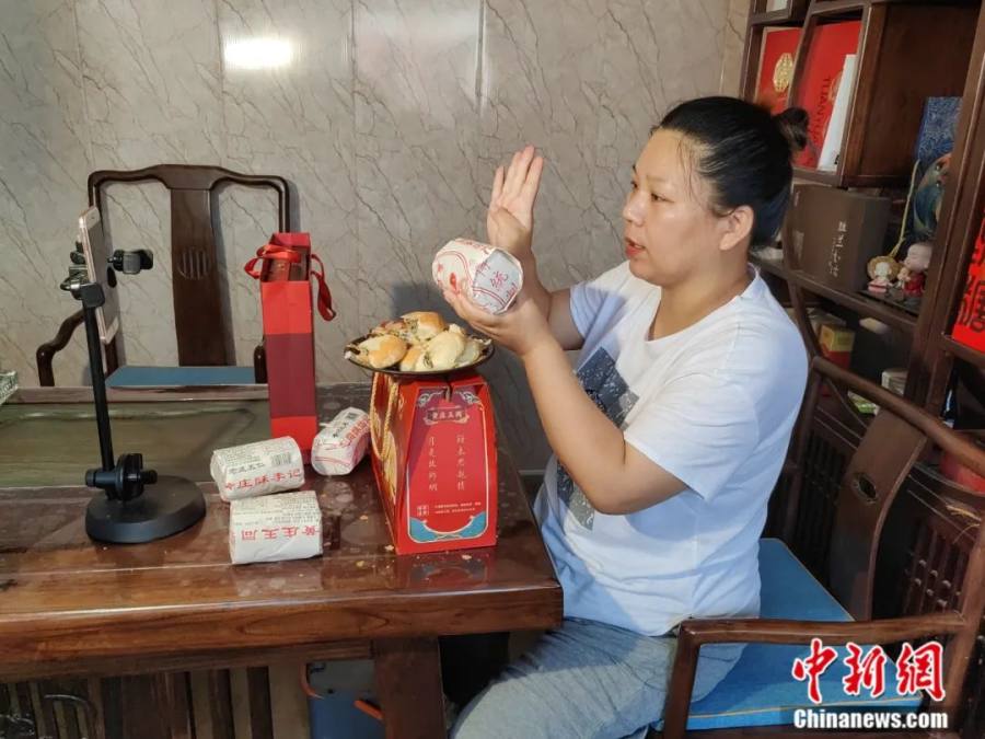 图为主播正在通过电商直播的方式销售月饼。 王俭 摄