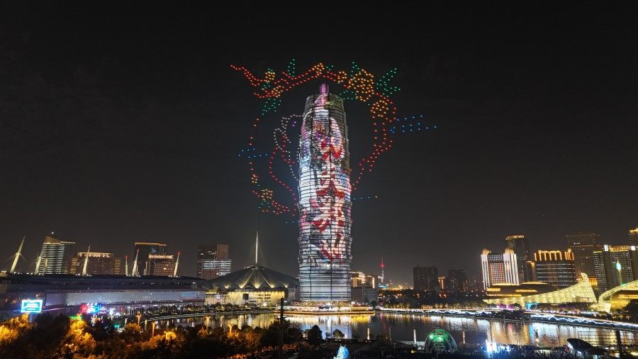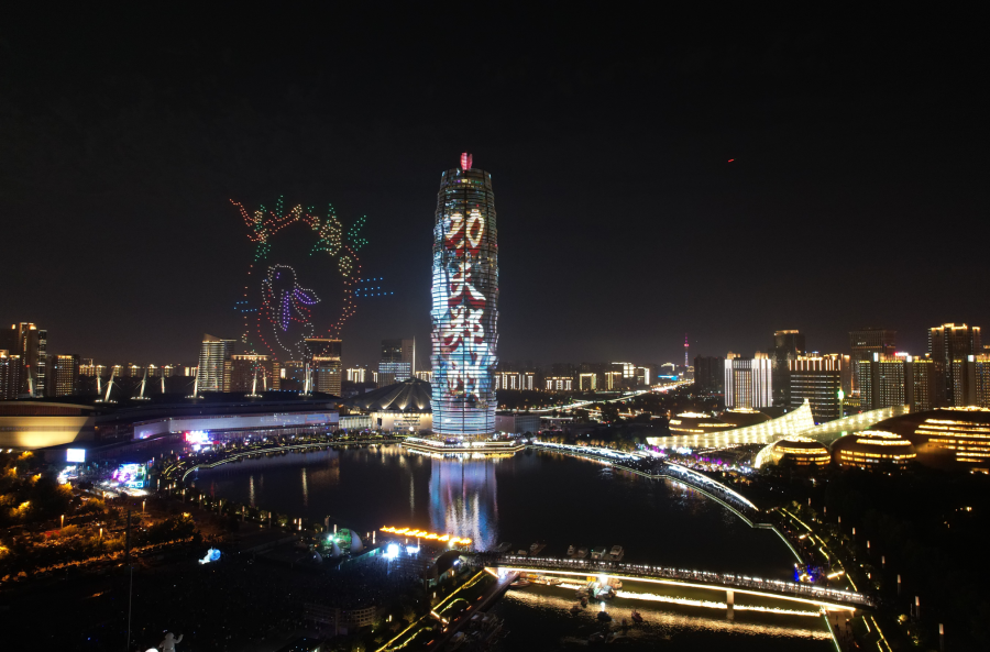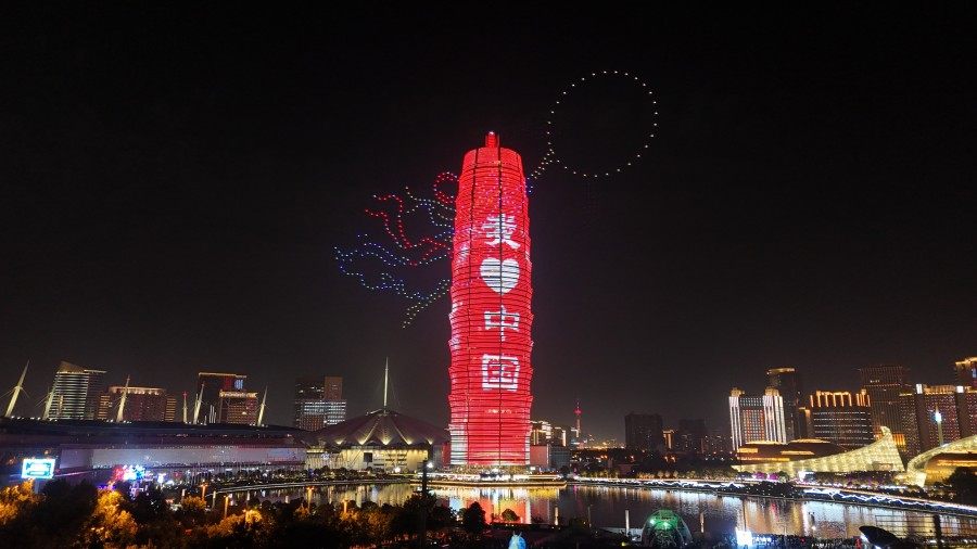 皓月当空,夜色晴好。晚上8点、9点两个时间段,如意湖广场上繁星点点准时亮起,近千架无人机嗡鸣着腾空而起,在空中腾挪变幻出各种图案:衣袂翩跹的嫦娥缓缓抬手,向月亮奔赴;活灵活现的玉兔在天空中出现、玩耍;五星红旗在夜空中缓缓升起,熠熠生辉;拼搏姿态的运动员形体舒展,为亚运会加油呐喊;“天地之中 华夏之源 功夫郑州”口号,助力弘扬郑州城市品牌……
