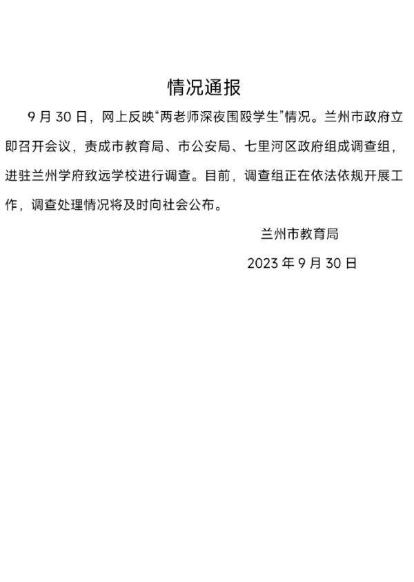 9月30日,甘肃省兰州市教育局通过其官方微博@兰州教育 发布《情况通报》:网上反映“两老师深夜围殴学生”情况。兰州市政府立即召开会议,责成市教育局、市公安局、七里河区政府组成调查组进驻兰州学府致远学校进行调查。目前,调查组正在依法依规开展工作,调查处理情况将及时向社会公布。