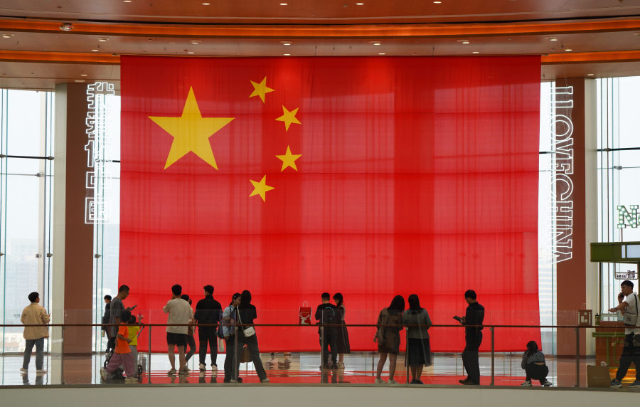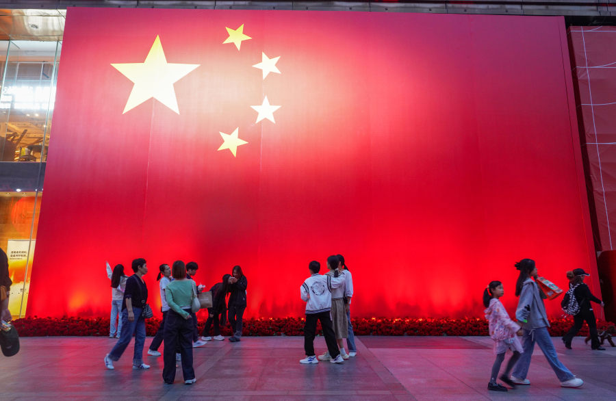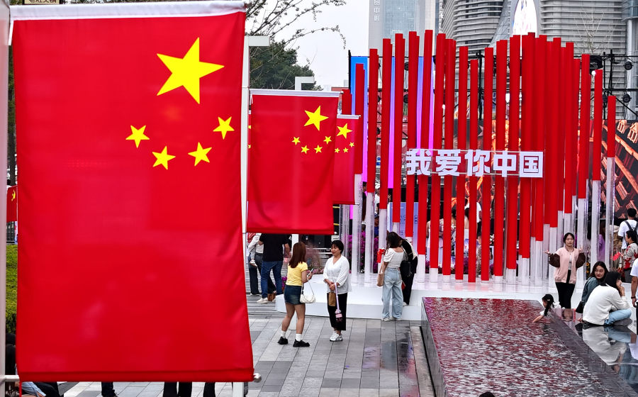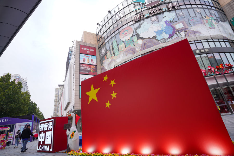昨日,郑州街头纷纷挂起五星红旗,沿街商铺和商场、公园等地旗帜飘扬,彰显庄严与喜庆。不少市民带着孩子手持国旗走上街头,共迎国庆。
