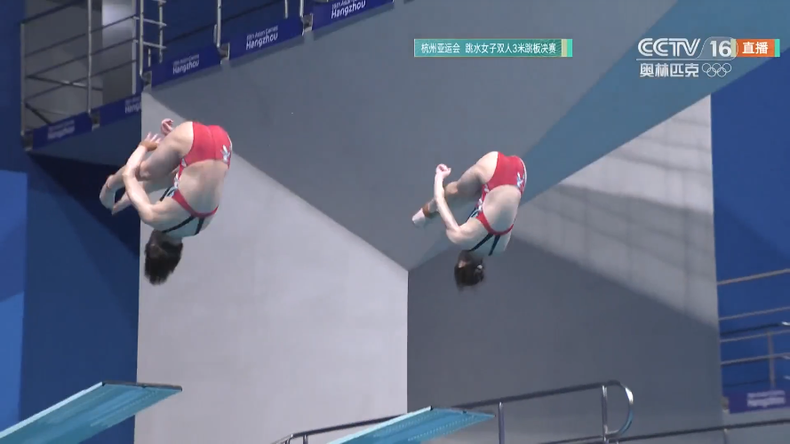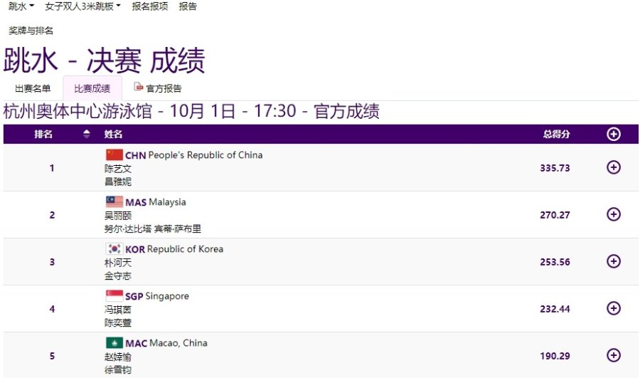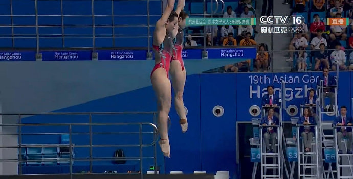 10月1日,杭州第19届亚运会跳水女子双人3米跳板比赛,中国组合陈艺文/昌雅妮以335.73分夺得金牌。