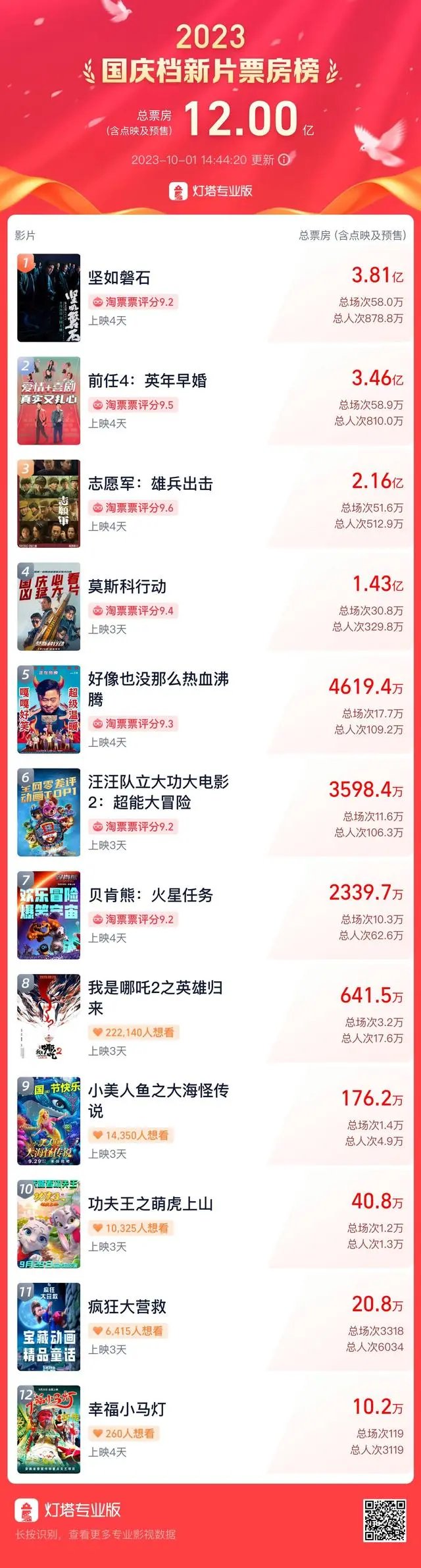 据统计数据显示,截至10月1日14时44分,2023年国庆档新片总票房(含预售)突破12亿元。《坚如磐石》《前任4:英年早婚》《志愿军:雄兵出击》暂列前三位。