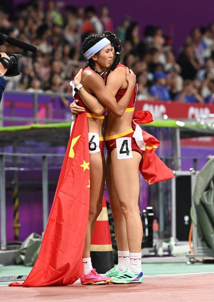 10月1日,中国选手林雨薇(左)和吴艳妮在比赛后拥抱。新华社记者 江汉 摄