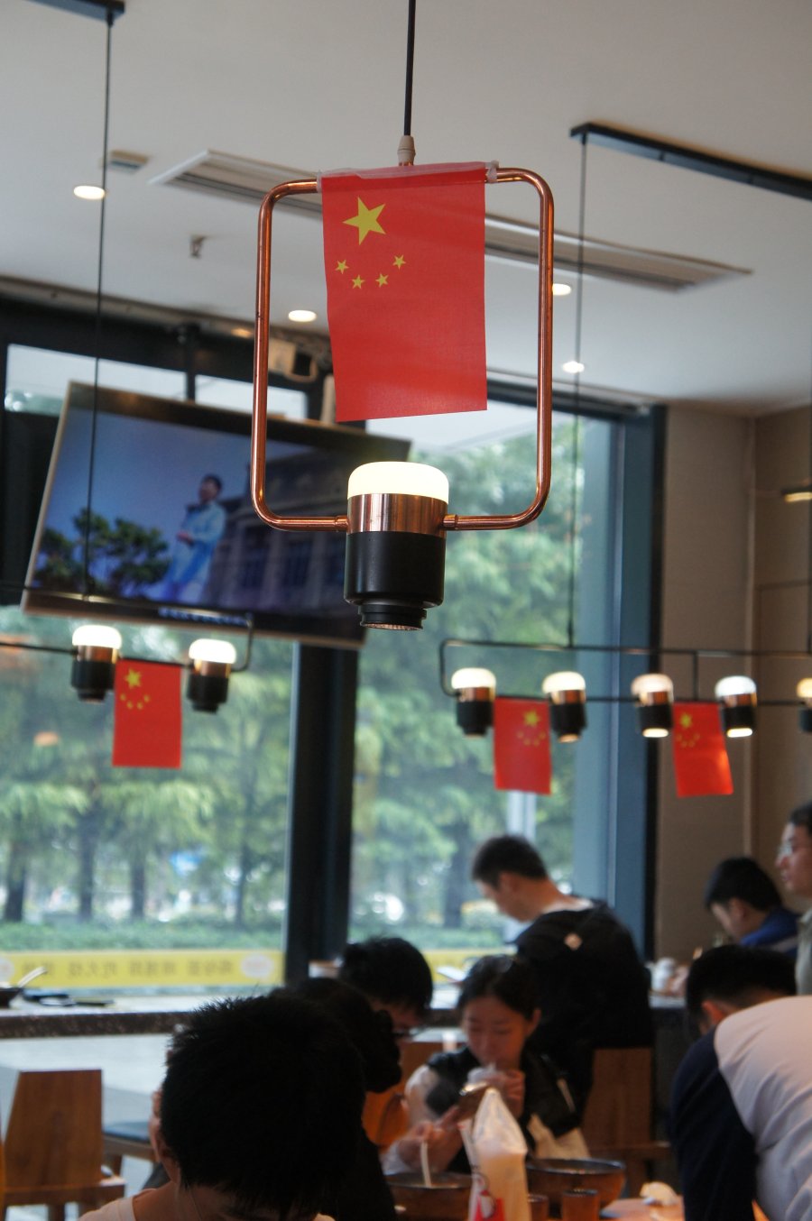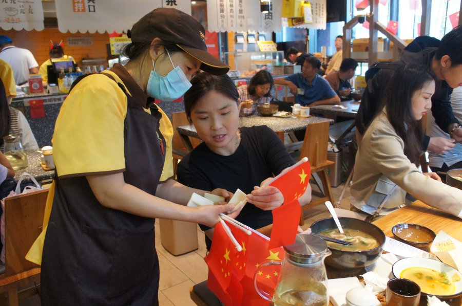 正与家人聚餐的李先生收到服务员送上的免费“国庆面”以及小红旗很是惊喜。他直言:“去年的国庆节是在疫情中度过的,太遗憾了,而今年浓浓的‘中国红’氛围,仪式感满满。”