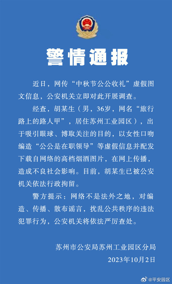 据苏州市公安局苏州工业园区分局10月2日通报,近日,网传“中秋节公公收礼”虚假图文信息,公安机关立即对此开展调查。经查,胡某生(男,36岁,网名“旅行路上的路人甲”,居住苏州工业园区),出于吸引眼球、博取关注的目的,以女性口吻编造“公公是在职领导”等虚假信息并配发下载自网络的高档烟酒图片,在网上传播,造成不良社会影响。目前,胡某生已被公安机关依法行政拘留。