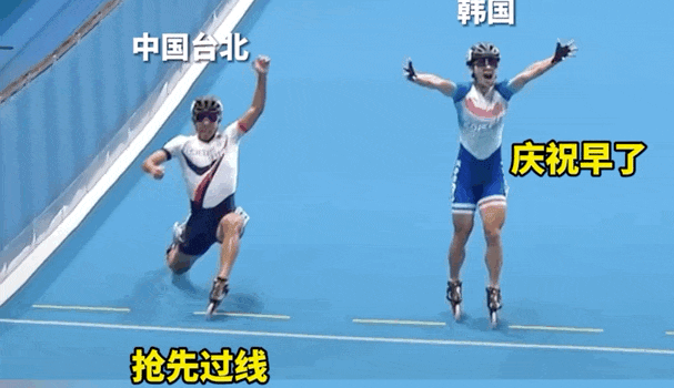 2023年10月2日,杭州亚运会男子速度轮滑场地赛3000米接力赛决赛,韩国选手郑喆元在最后冲刺阶段并未做出积极压线动作,而是早早起身欢呼庆贺,中国台北队靠着选手黄玉霖0.01秒的奇迹压线,以4分05秒692,惊险胜过韩国的4分05秒702顺利夺金,喜迎本届亚运会第11金。