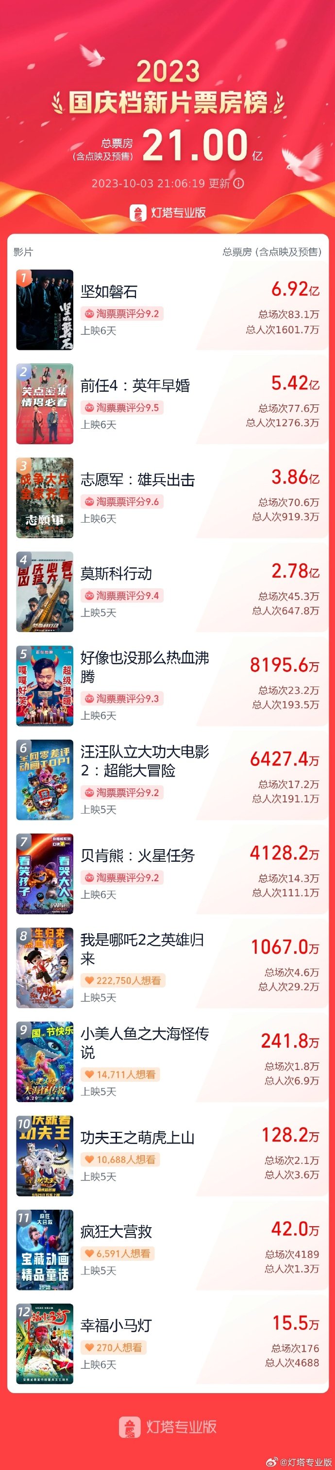 据灯塔专业版数据,截至10月3日17时37分,2023年国庆档新片总票房(含预售)突破20亿元!《坚如磐石》以6.57亿元领跑国庆档,《前任4:英年早婚》《志愿军:雄兵出击》分列二三位。国庆假期过半,你都看了哪几部影片?