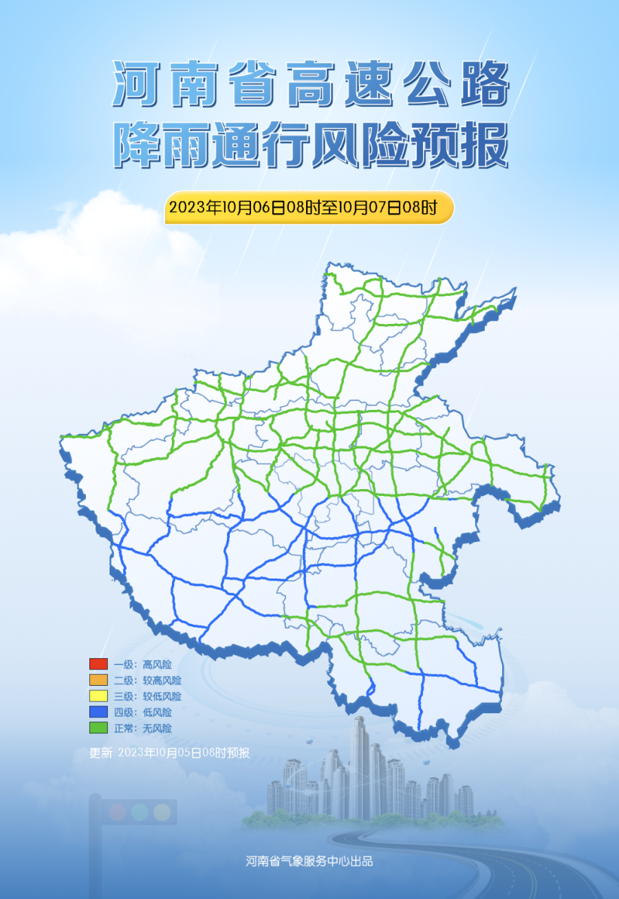 预计10月5日和6日,降水和雾将给河南返程交通带来一定不利影响。其中:5日中西部、西南部部分路段有降雨通行风险,6日黄河以南部分路段有降雨通行风险。