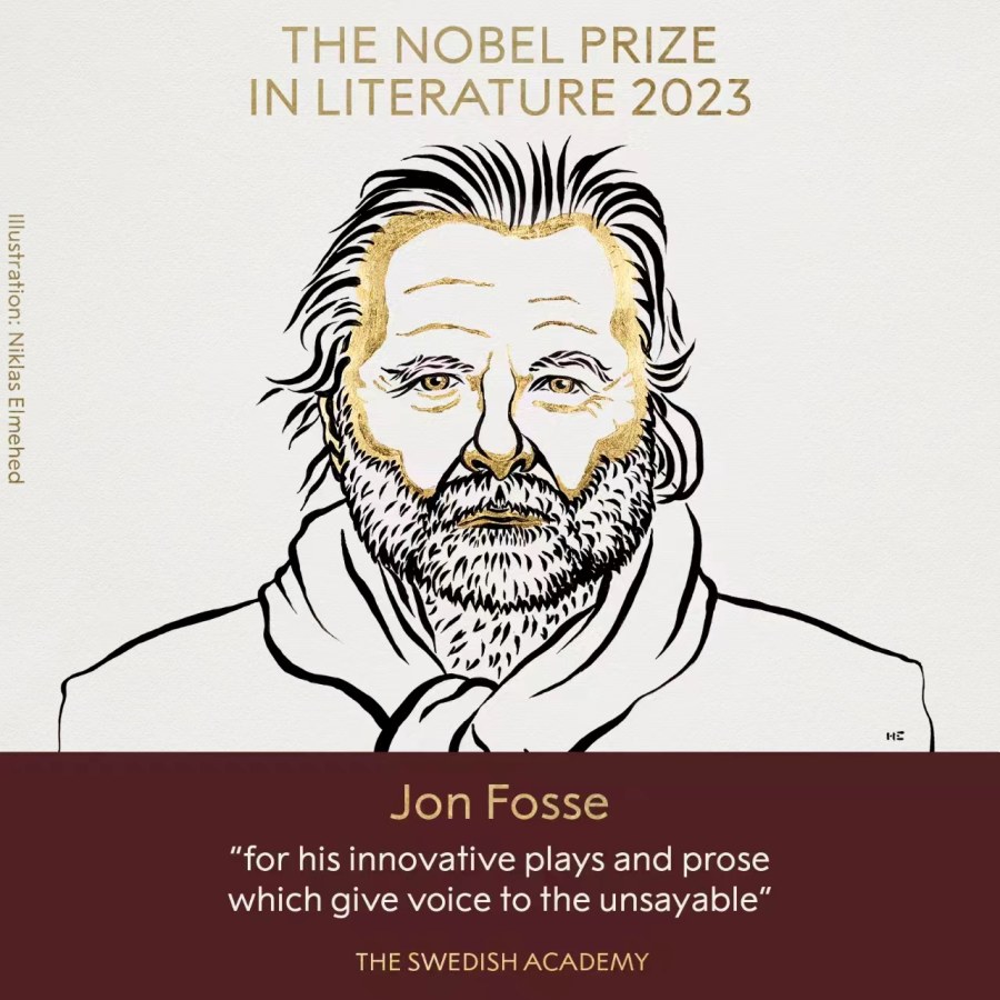 瑞典斯德哥尔摩当地时间2023年10月5日13:00(北京时间19:00),瑞典学院将2023年度诺贝尔文学奖颁给了挪威剧作家约翰·福瑟(Jon Fosse),以表彰他“创新的戏剧和散文,为不可言说的事情发声”。