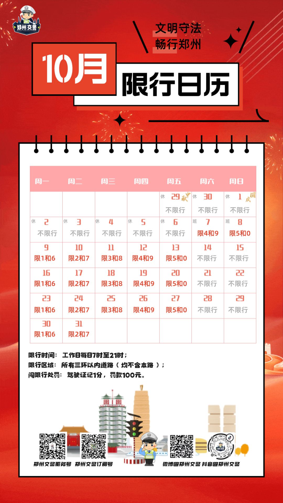 10月7日(周六)机动车尾号限行4和9