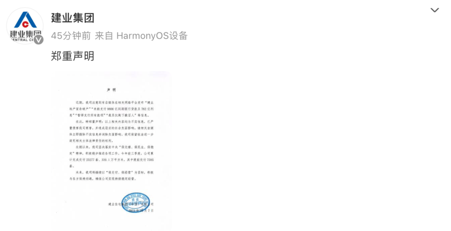 10月7日,建业集团官方微博发布《声明》,对“建业地产宣告破产”、“未能支付9800亿到期银行贷款及762亿利息”、“暂停支付所有款项”、“裁员仅剩下数百人”等信息进行正式辟谣,声明中指出,建业集团将保留依法进一步追究相关主体法律责任的权利。