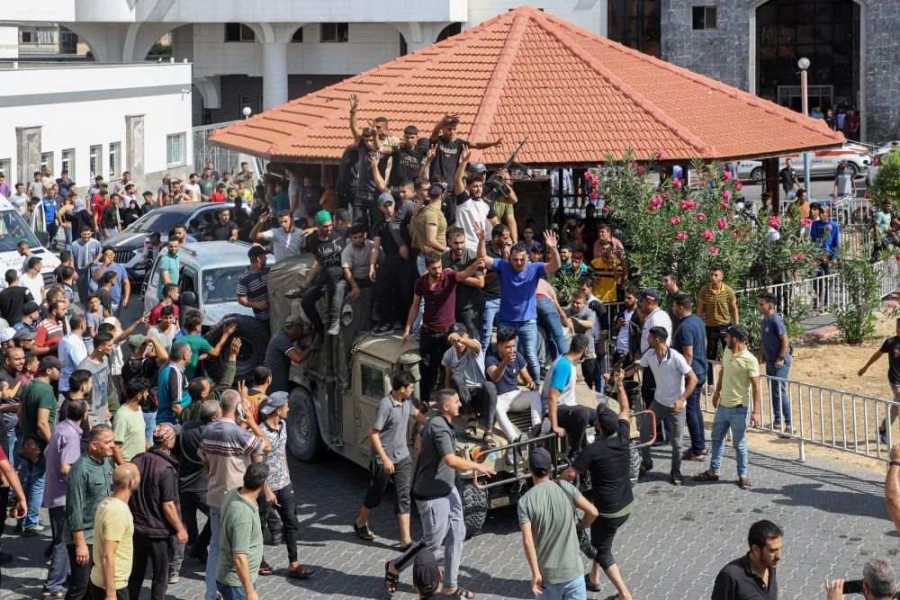 10月7日,在加沙城,巴勒斯坦人登上一辆以色列军用车辆。新华社发(里泽克·阿卜杜勒贾瓦德摄)