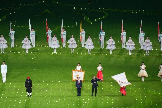 交接过程新意十足。第一届亚运会火炬、第一届亚运会会旗,以及亚奥理事会会旗,依次从杭州市市长姚高员手中,传递到辛格代主席手中,再传递至爱知县·名古屋的代表手中,两位日本代表连续挥舞向全场观众和运动员致敬。随着奏响日本国歌、日本国旗升起,会旗交接仪式顺利完成。