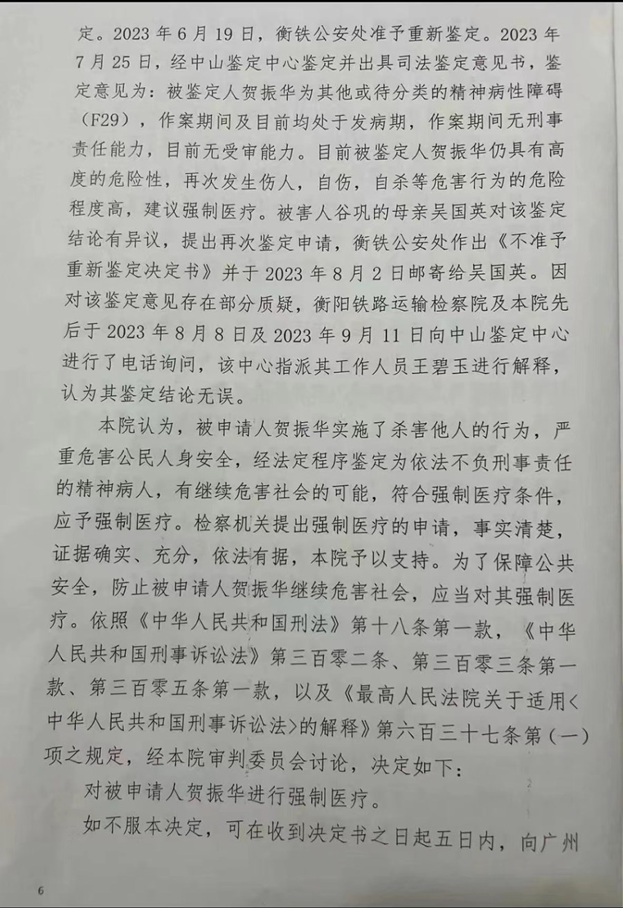 根据衡阳铁路运输法院相关文书,杀害谷巩的贺振华被鉴定为精神病人,作案时无刑事责任能力,“依法不负刑事责任”。