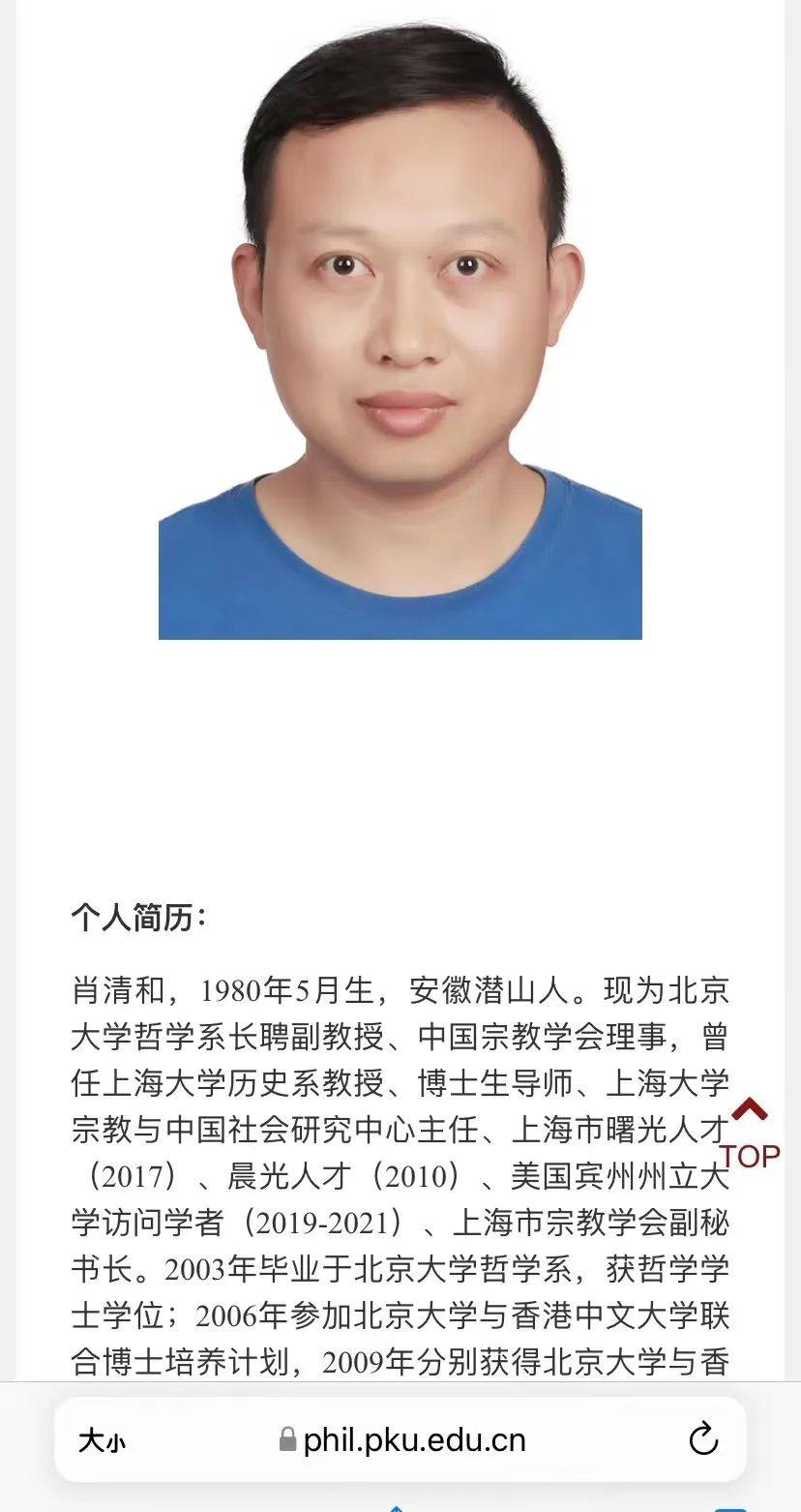北京大学公布的简历显示,肖清和,1980年5月生,安徽潜山人。现为北京大学哲学系长聘副教授、中国宗教学会理事,曾任上海大学历史系教授、博士生导师、上海大学宗教与中国社会研究中心主任、上海市曙光人才(2017)、晨光人才(2010)、美国宾州州立大学访问学者(2019-2021)、上海市宗教学会副秘书长。