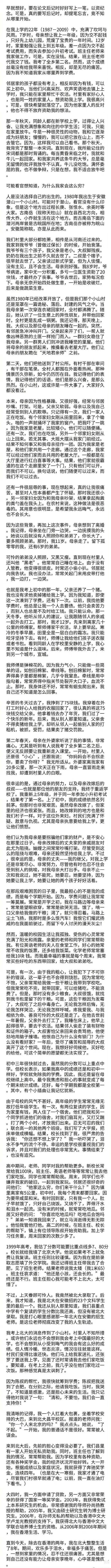 文末,肖清和愧疚写道:“直到今天,除去在香港的两年,我在北大整整生活了8年。期间,欢乐多于泪水,幸福多于痛苦。但是,一想到家里的情况,忍不住还很痛苦。尤其是想到自己还没有能力让母亲安享晚年,心中甚是愧疚。”
