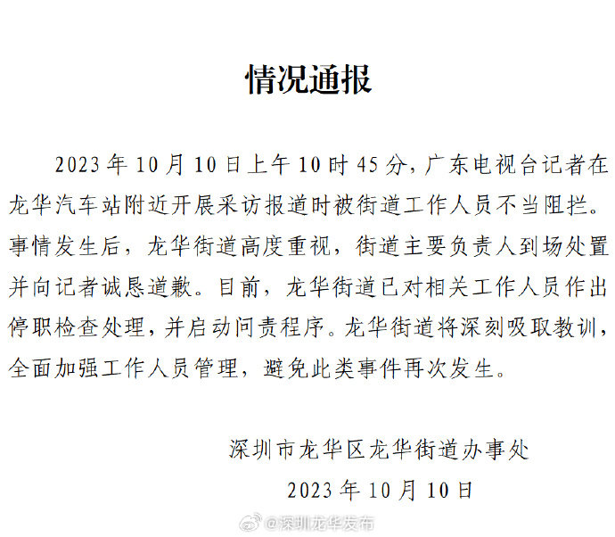 10日下午,@深圳龙华发布 发布情况通报:2023年10月10日上午10时45分,广东电视台记者在龙华汽车站附近开展采访报道时被街道工作人员不当阻拦事情发生后,龙华街道高度重视,街道主要负责人到场处置并向记者诚恳道歉。目前,龙华街道已对相关工作人员作出停职检查处理,并启动问责程序。龙华街道将深刻吸取教训,全面加强工作人员管理,避免此类事件再次发生。
