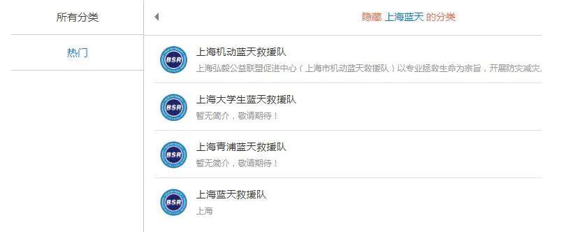 “蓝天救援·中国”官网品牌授权队伍查询中,上海蓝天旗下分类有4支队伍