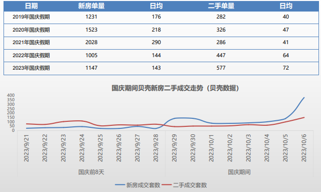根据贝壳研究院郑州分院数据显示,中秋国庆长假期间,新房带看量14242组,较上周增长8467组,成交1147套,同比增长14.1%;二手房带看量14895组,较上周增长3585组,成交577套,同比增长29.1%。尤其是新房方面,假期期间带看量、成交数据有了明显的增长,根据成交走势曲线,在假期最后两天,达到了新房成交的“高潮”。