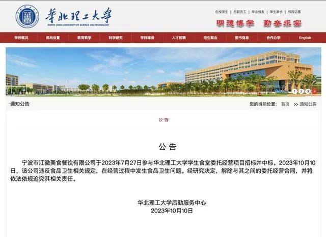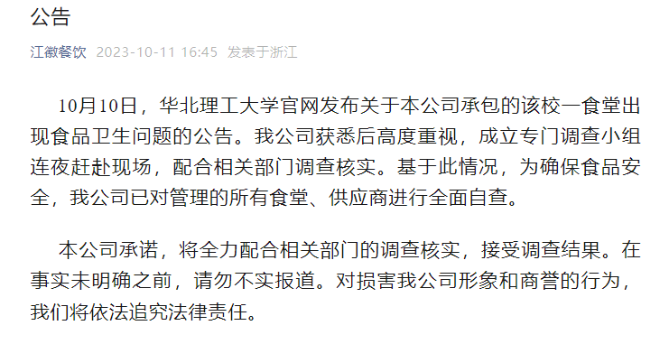 江徽餐饮发布公告称,10月10日,华北理工大学官网发布关于本公司承包的该校一食堂出现食品卫生问题的公告。我公司获悉后高度重视,成立专门调查小组连夜赶赴现场,配合相关部门调查核实。基于此情况,为确保食品安全,我公司已对管理的所有食堂、供应商进行全面自查。