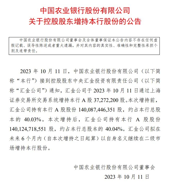 农业银行发布关于控股股东增持本行股份的公告称,控股股东汇金公司于10月11日通过上海证券交易所交易系统增持本行A股3727.22万股;汇金公司拟在未来6个月内(自本次增持之日起算)以自身名义继续在二级市场增持本行股份。