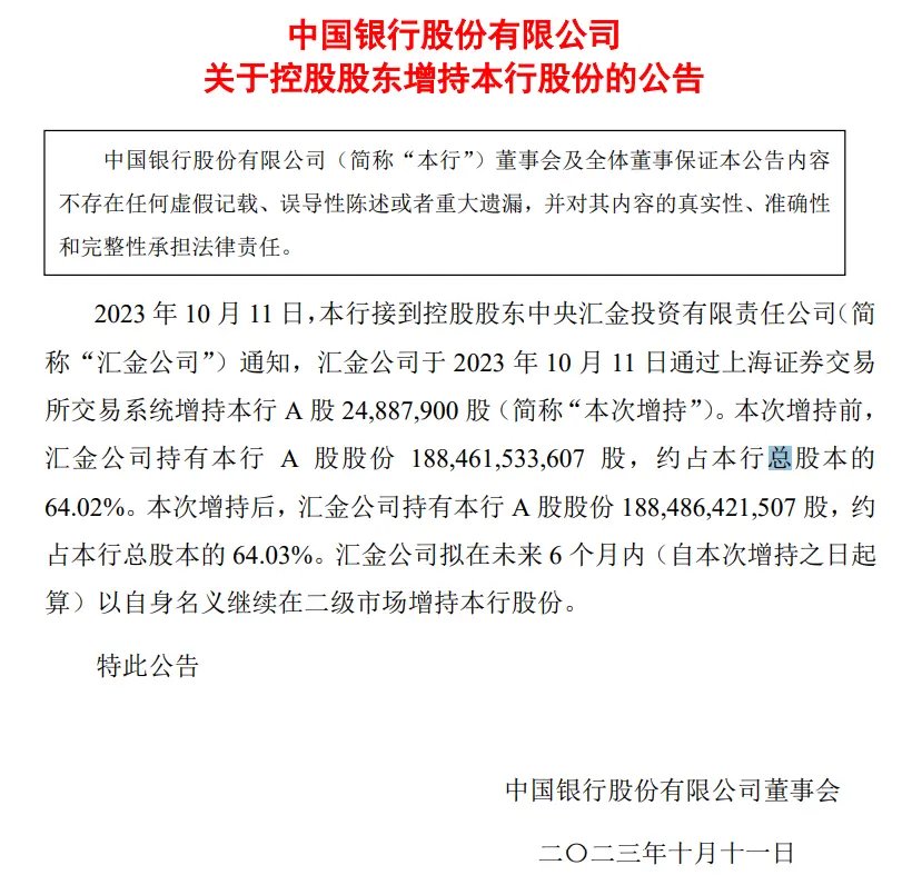 中国银行也发布关于控股股东增持本行股份的公告称,控股股东汇金公司增持本行2488万股A股股份。