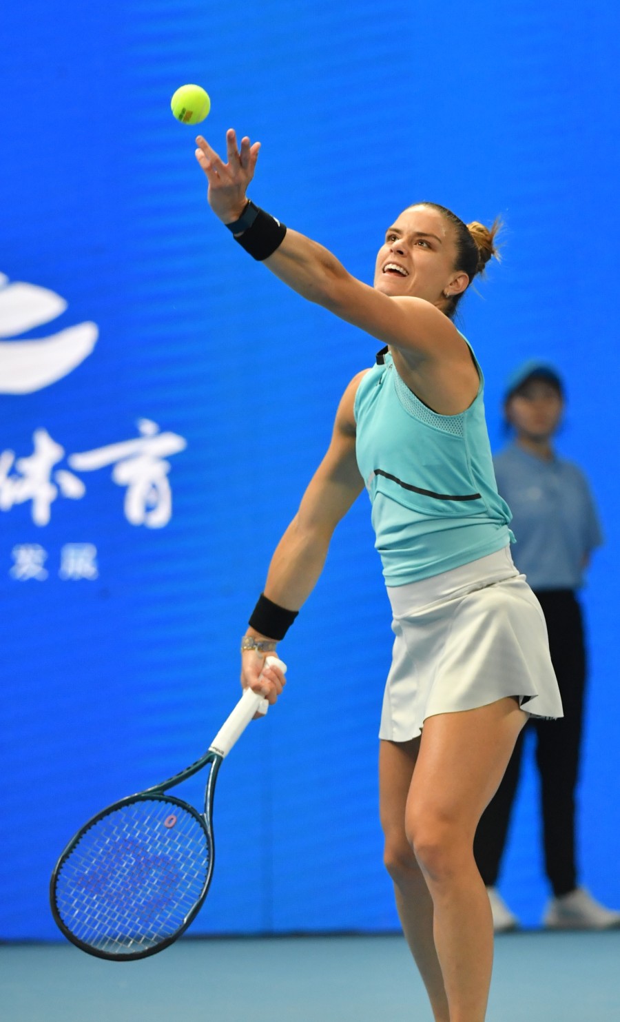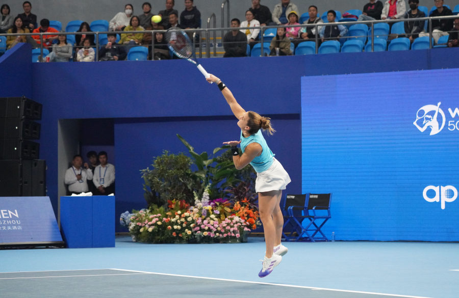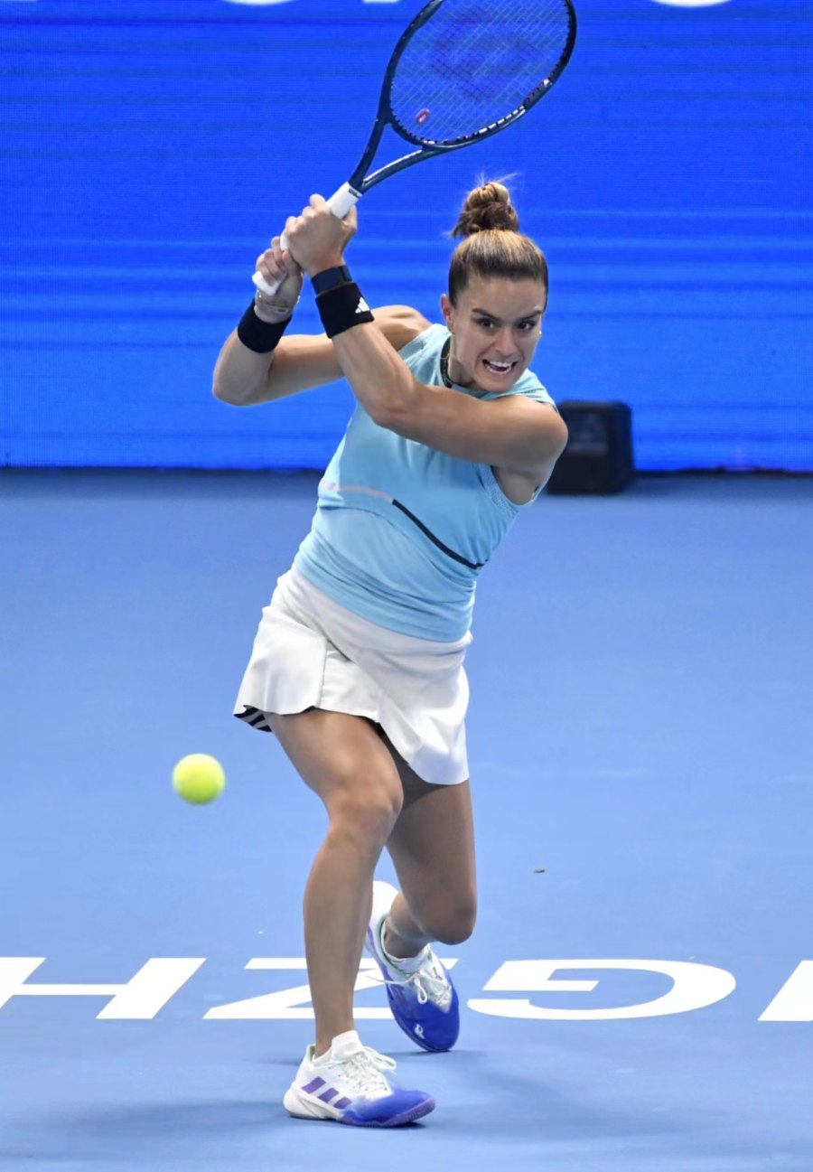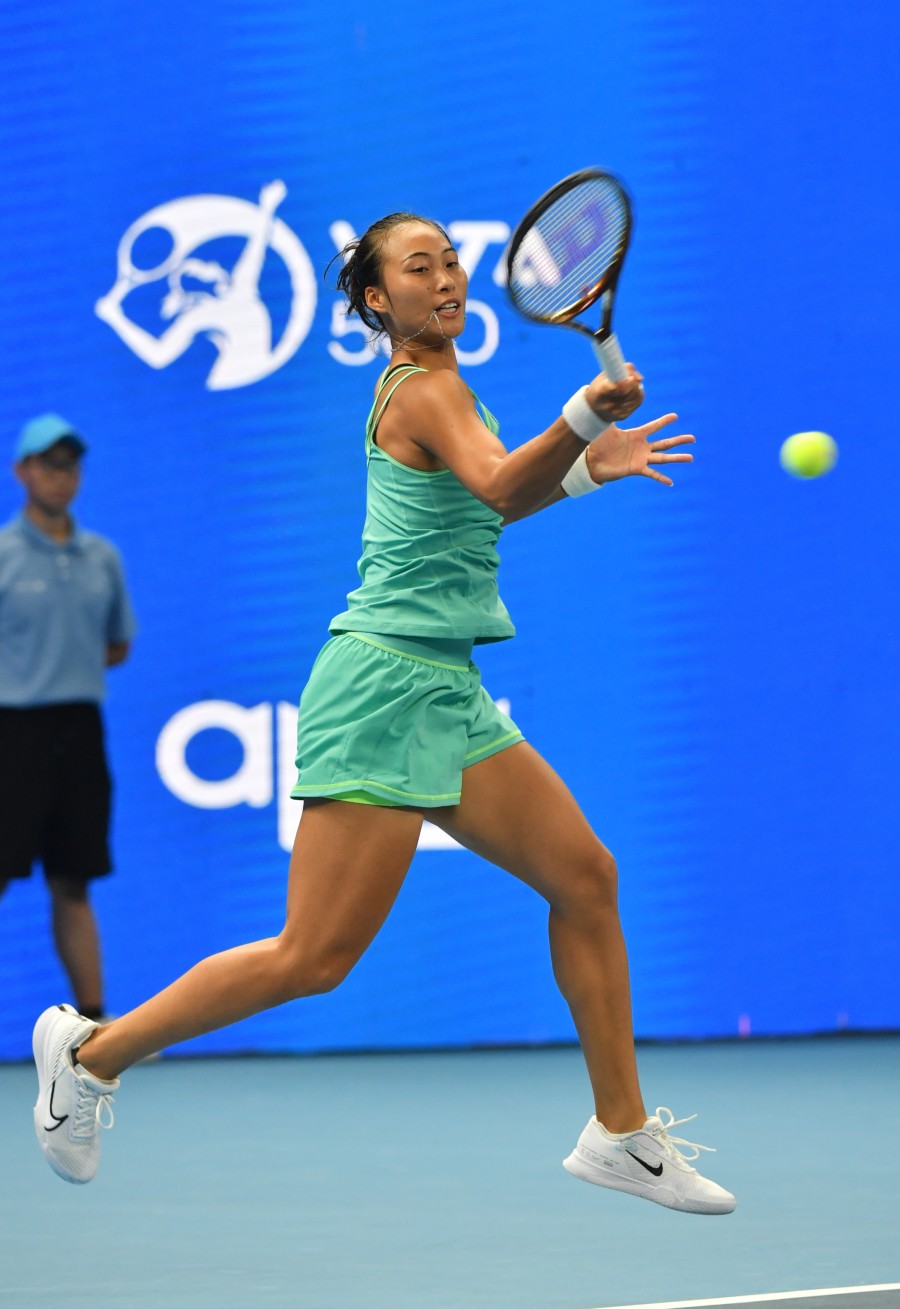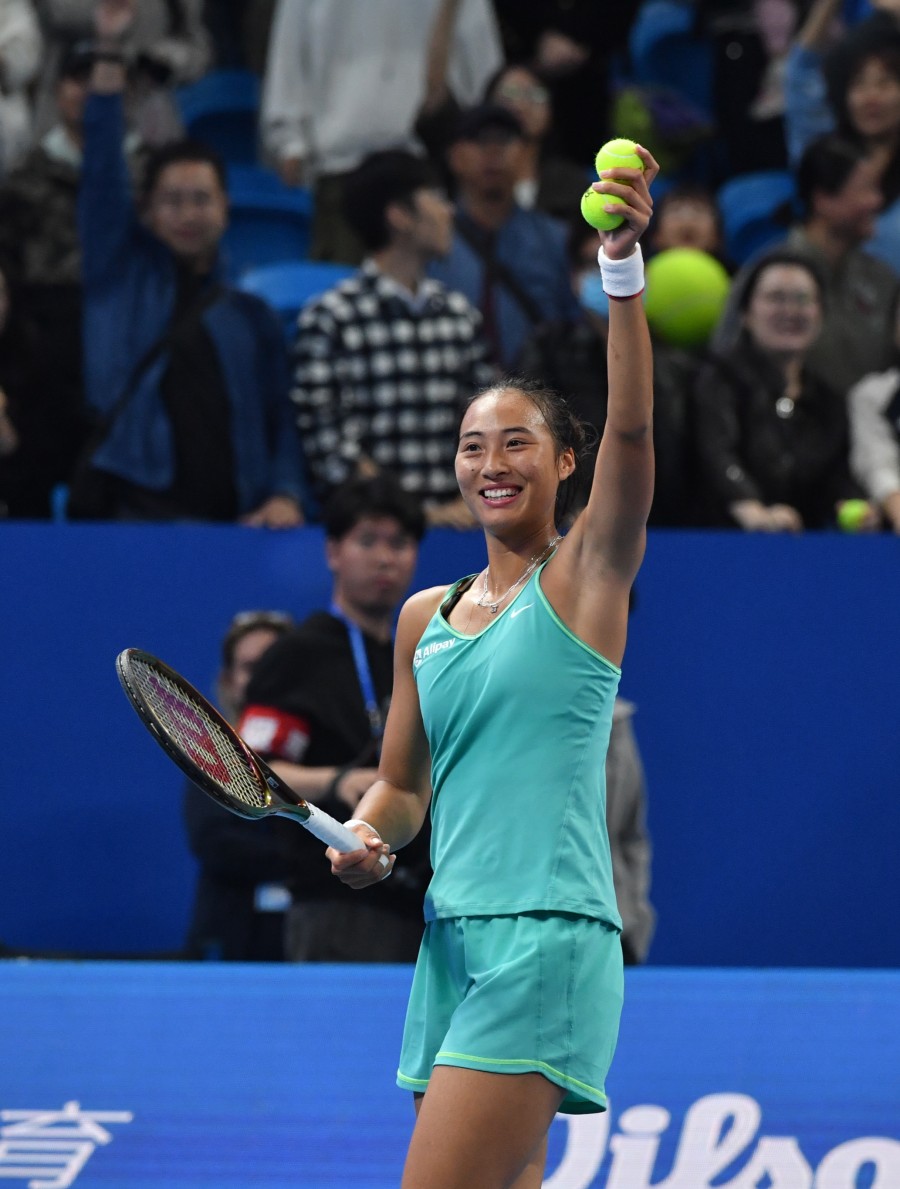 ▲ 10月11日,2023交通银行郑州网球公开赛进入正赛单打的第二轮比赛,中国选手郑钦文对战希腊萨卡里