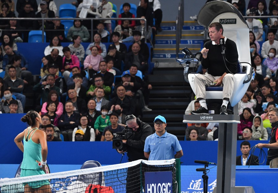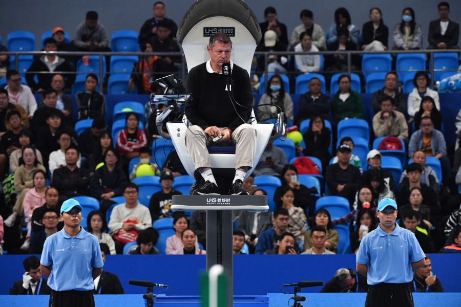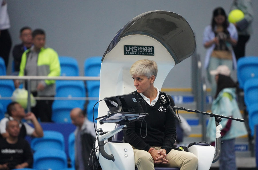 ▲郑州网球公开赛上,网球裁判的裁判席特别吸引观众的眼球,比赛中座椅上升至高位以便于裁判的判罚,比赛结束后可以操控降下来,裁判很轻松就可以离开座位
