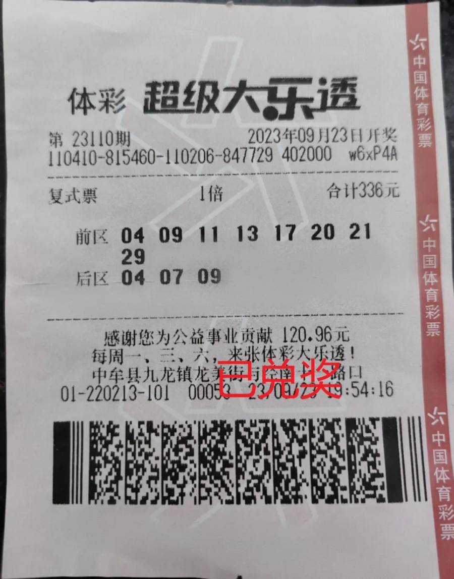 2023年9月23日,体彩超级大乐透第23110期开奖,开奖号码前区为“04、09、11、13、17”,后区开出号码“07、08”,位于郑州市中牟县九龙镇龙美街与经南十一路口的4101220213体彩实体店喜中大乐透二等奖2注。