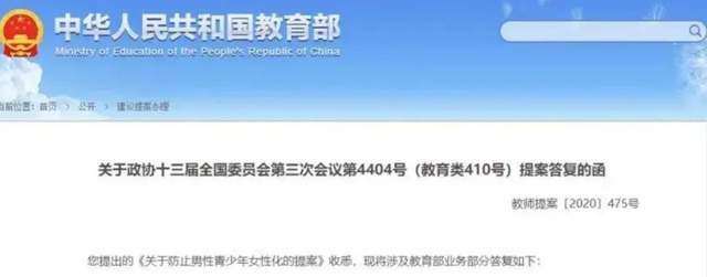 针对有全国政协委员提出《关于防止男性青少年女性化的提案》。1月28日,教育部官网发布的《关于政协十三届全国委员会第三次会议第4404号(教育类410号)提案答复的函》表示,将“更多注重学生‘阳刚之气’培养”。