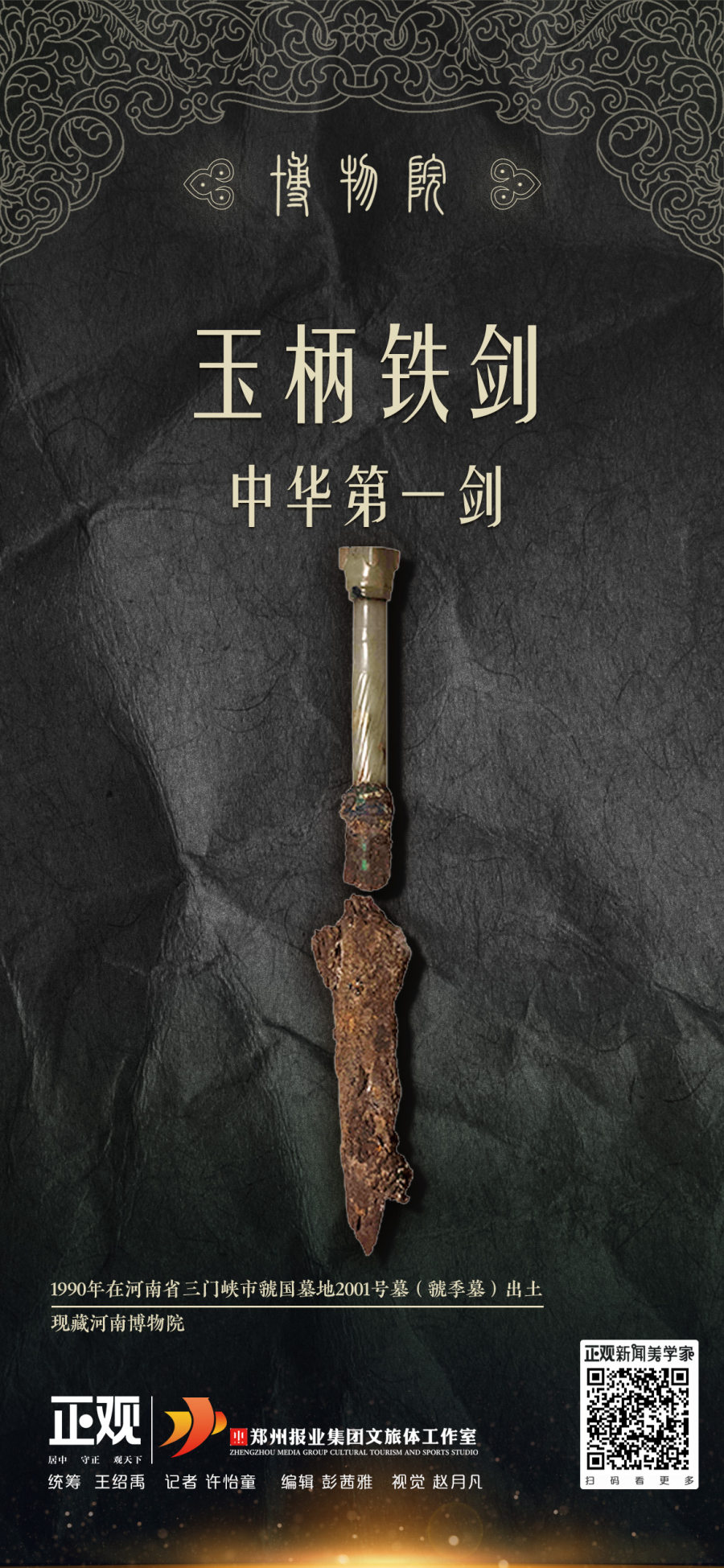 玉柄铁剑,西周晚期文物,通长34.2厘米,柄长12.2厘米,剑身长22厘米,叶宽3.8厘米,玉剑茎最大直径1.8厘米。剑身插在精心制作的牛皮鞘内,剑外有丝织品包裹的痕迹,剑柄是由和田青玉制成,剑柄中空,里面插有铜制的芯,连接剑身和剑柄。由于埋藏久远,剑身已断为两截,鞘身也因锈蚀与剑身粘在一起,无法剥离。1990年在河南省三门峡市虢国墓地2001号墓(虢季墓)出土。