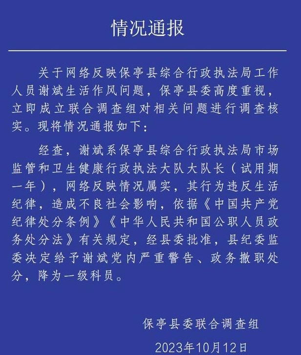 关于网络反映保亭县综合行政执法局工作人员谢斌生活作风问题,保亭县委高度重视立即成立联合调查组对相关问题进行调查核实。现将情况通报如下: