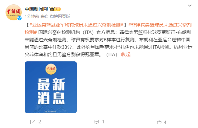 国际兴奋剂检测机构(ITA)官方消息:菲律宾男篮归化球员贾斯汀-布朗利未能通过兴奋剂检测。球员有权要求对B样本进行复测。布朗利在亚运会逆转中国男篮的比赛中狂砍33分,此外约旦国手萨米-巴扎伊也未能通过ITA检测。杭州亚运会菲律宾和约旦男篮分别获得冠亚军。
