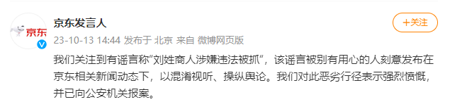 10月13日,@京东发言人 回应“刘姓商人涉嫌违法被抓”谣言称,谣言被别有用心的人刻意发布在京东相关新闻动态下,以混淆视听、操纵舆论,目前已向公安机关报案。