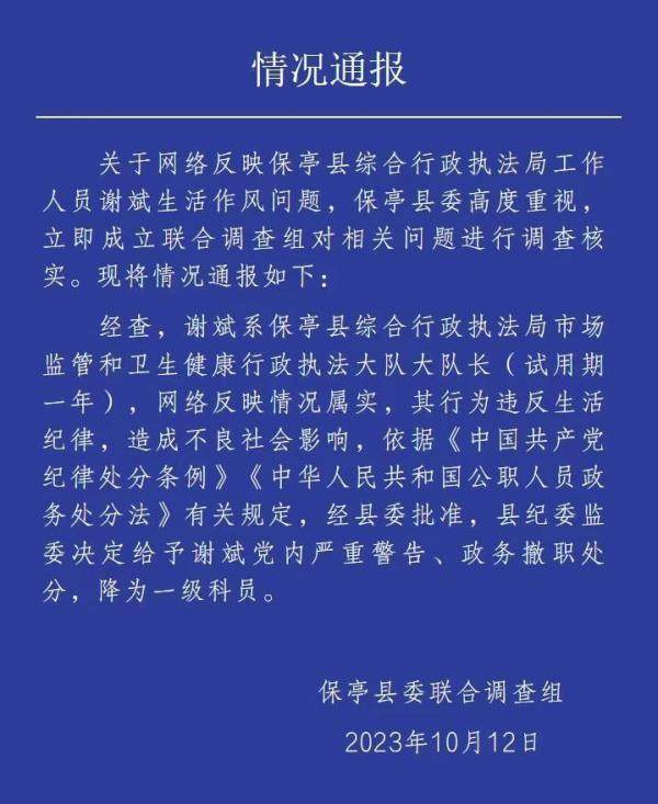 10月7日,有网友发文举报称,海南保亭县综合行政执法局市场监管和卫生健康行政执法大队大队长谢斌与其恋爱期间偷偷和他人领证结婚,但仍与其保持恋爱关系,构成婚内出轨事实。10月12日,保亭县委联合调查组发布通报,决定给予谢斌党内严重警告、政务撤职处分,降为一级科员。