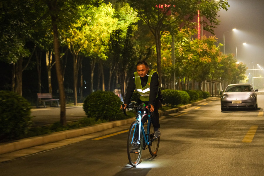 赛道丈量是马拉松赛事的重要一环,为了避开白天道路上的车辆和行人,以便进行更加精准的定位和测量,郑马赛道丈量工作在晚上9点30分正式开始。本次赛道丈量采用目前国际通用的“标定自行车测量法”,测量工具主要为一辆自行车和一个琼斯计数器。赛道丈量主要靠安装在自行车前轮轴承部位、火柴盒大小的琼斯计数器,骑行过程中通过计算自行车车轮转动,来精确计算出全部赛程点位的位置。
